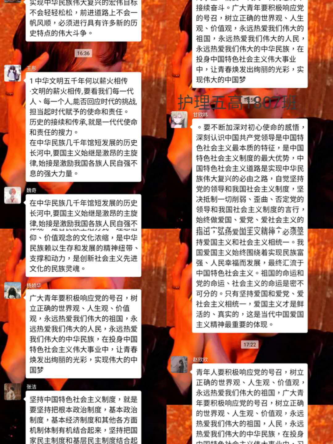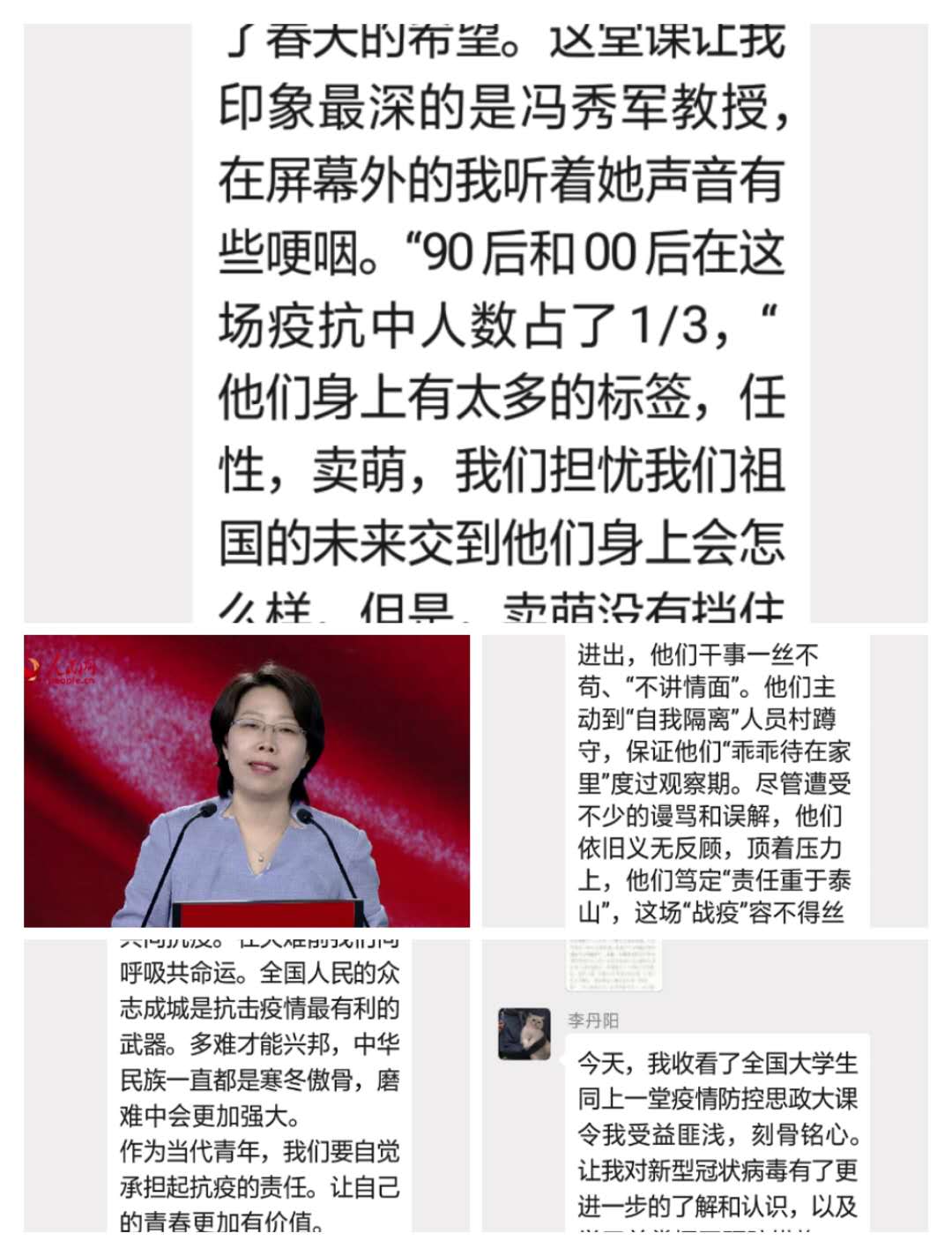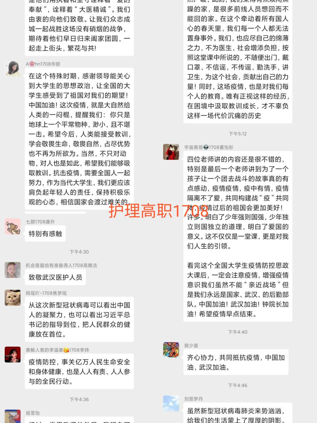 观看结束后,我院学生以班级为单位,在学管人员的指导下,开展了线上主题班会。师生们结合学科专业特点展开了讨论。星空XK体育党总支书记吴运胜认为:“对于星空XK体育的师生来说,这次思想政治教育课安排得很及时。在这场战‘疫’中,党和政府从历史中总结经验,担起人类命运共同体的责任,用‘武汉封城’的强大魄力,向世界彰显了中国共产党领导和中国特色社会主义制度的显著优势。作为党的教育工作者,我们要积极教育引导广大学生,坚定在以习近平同志为核心的党中央坚强领导下打赢这场疫情防控人民战、总体战、阻击战的信心和决心。”党总支副书记马淑红认为:“课堂中的战疫小故事,让我们看到了当代青年的大勇、大我和大德,我们要积极宣传学生身边的榜样事迹,继续引导广大青年学生勇担使命,积极奉献社会,为实现中华民族的伟大复兴梦而奋斗。”学生科科长李博认为:“这堂公开课兼具思想高度和理论深度,有数据有实例,有情感有温度,进一步增强了大学生的‘四个自信’,激发大学生的爱国热情和创新创业的动力。”护理高职1804班学生王晔在班会中说:“作为一名00后护生,我们要牢记医学生誓言和南丁格尔誓言,向奔赴疫情前线的前辈学习,做到胸有大志、心有大我、肩有重任、行有大德,用实际行动谱写自己大写的青春。”(撰稿:星空XK体育 王蓉 审核:李晓乾)