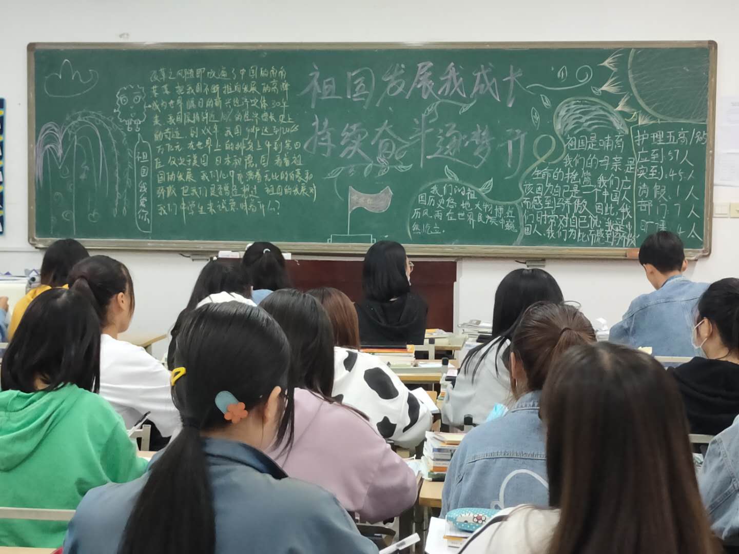 各班团支书以板报、PPT等形式向同学们宣讲了我国悠久厚重的历史知识和建国以来取得的辉煌成果;分享了爱国民族英雄和各时期劳动模范的事迹,讨论了如何做到祖国发展我成长,持续奋斗逐梦行。团支书希望同学们坚定政治理想信念,心系祖国,树立远大志向,对未来充满希望,为把祖国建设成物质文明,政治文明,精神文明的国际强国而不懈努力奋斗。