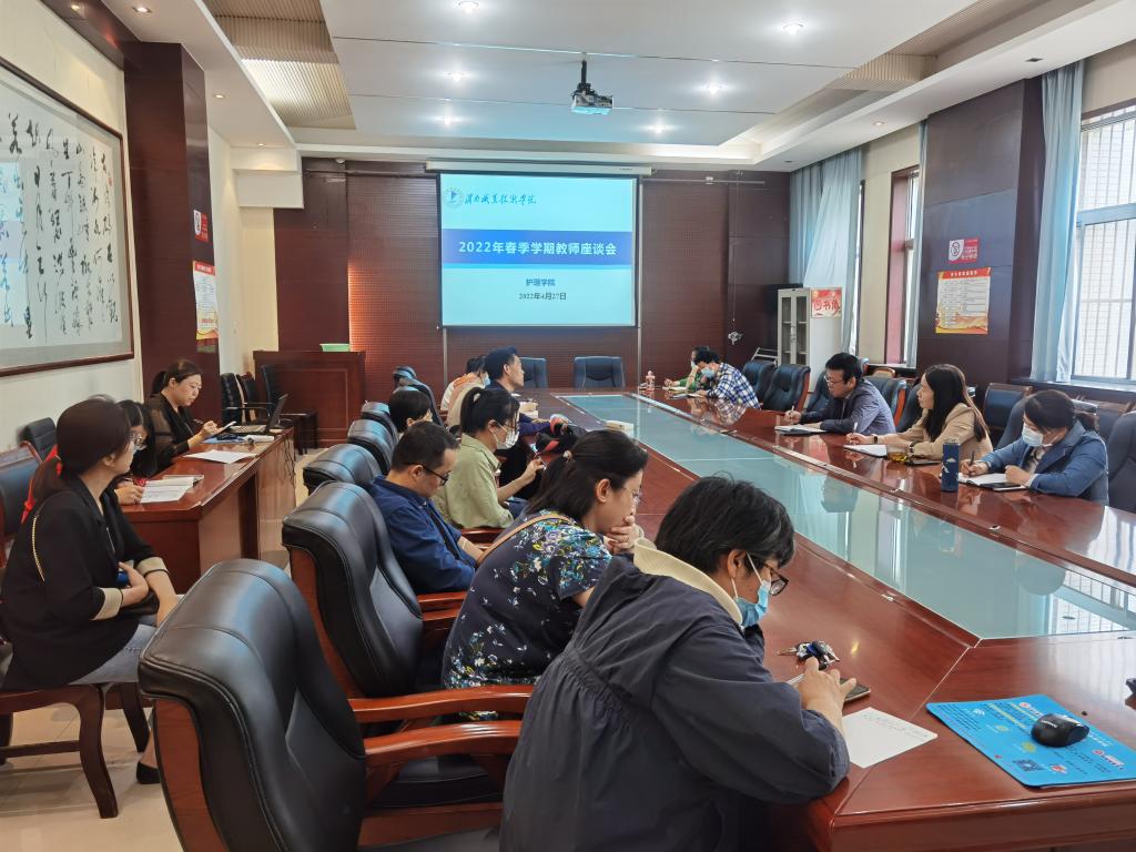 2022年4月27日下午,星空XK体育在医训南楼第一会议室召开了本学期教师座谈会。会议由教学副院长吴亚飞主持,院长张成、副书记李晓乾、教学科科长王媛及各教研室教师代表参加了会议。